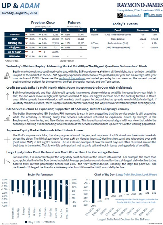Good afternoon. I had been writing a longer newsletter, but thought I’d get out a quick note on recent volatility. Right now, we’re viewing the type of normal pullback we get nearly every year—we usually get one around 10% even in bull markets. Given volatility has been so low, the market was rather complacent. You might have read, but a big part of it is the unwinding of a Yen carry trade after BOJ (Bank of Japan) hiked its interest rates, which has impacted many hedge funds. No, we didn’t have a carry trade in portfolios and have actively worked to avoid leverage within our positions. Of course, the world is on edge awaiting on any Iranian response to Israel. This will likely have an impact on energy markets, but Iranian oil has been under sanction and Israel is not a producer… it would more likely have an impact on the transportation of oil. As it has been in past and continues to be now, all eyes remain on the Fed. Now it is a virtual certainty that they will cut rates in September, if not before. Many on bubble vision are calling for an emergency rate cut. I mean, we’re hardly even in a correction and they’re already calling for it. I don’t think that will happen unless there are liquidity issues that surface, which doesn’t seem to be the case at this point. Attached is a good piece from Raymond James putting the latest volatility in perspective.