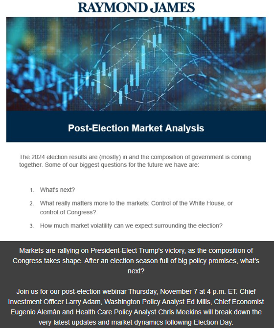 -Raymond James is hosting a conference about the markets post-election that is open to clients today, details below if you want to hear a more detailed discussion.